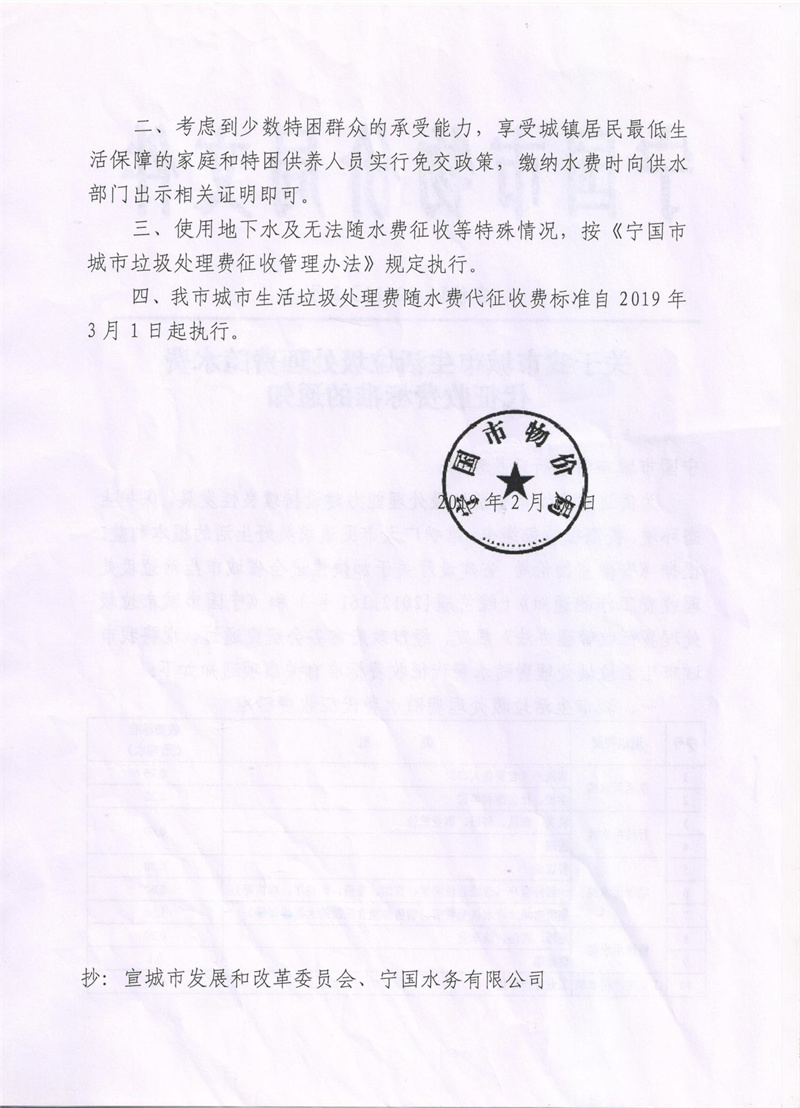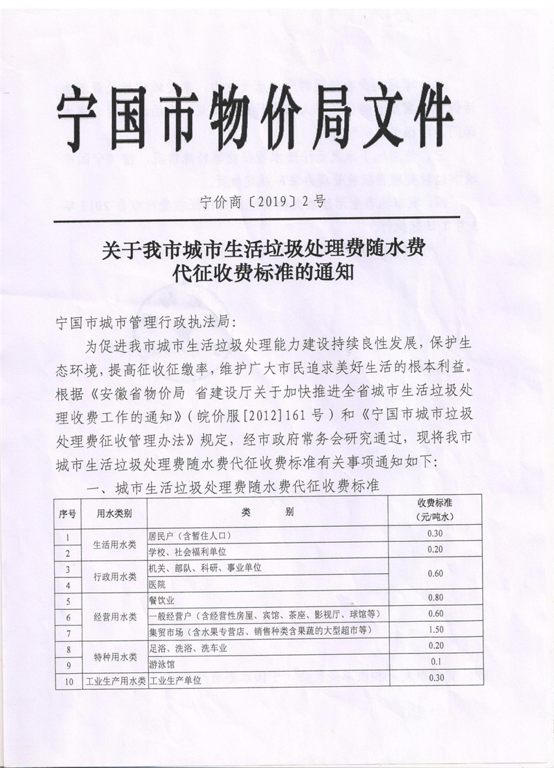 寧國市城市生活垃圾處理費隨水費代征收費標準